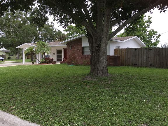 Attractive brick home, large corner lot in Melbourne neighborhood. Home offers 4 bedrooms with two full baths. Plenty of room for parking, 2 cars under carport, with room for 4 more cars. RV/trailer parking on side of house behind fence. Move in ready. Roomy eat in kitchen. Master bedroom en-suite bathroom including walk in shower. Carpeted guest bedrooms. Rear sliding door off dining room. Opens to large concrete patio with privacy fenced back yard.Convenient location with close proximity to shopping, medical, restaurants and schools. Seven miles from beach. Wickham Park, King Center and BCC all near by.