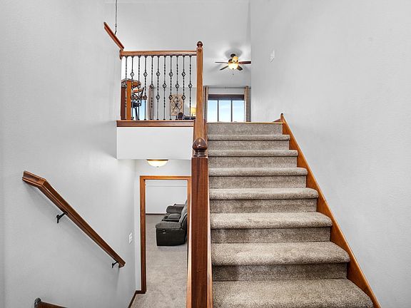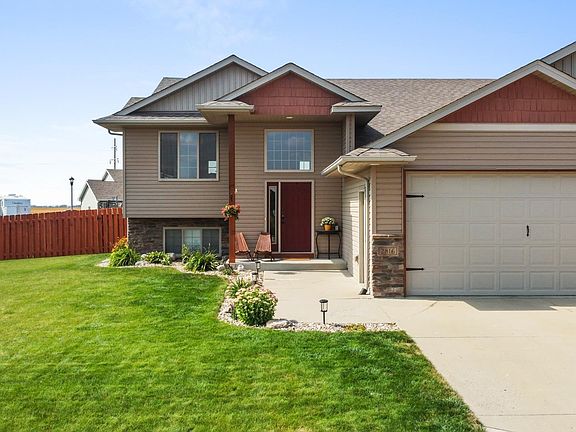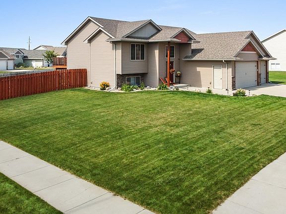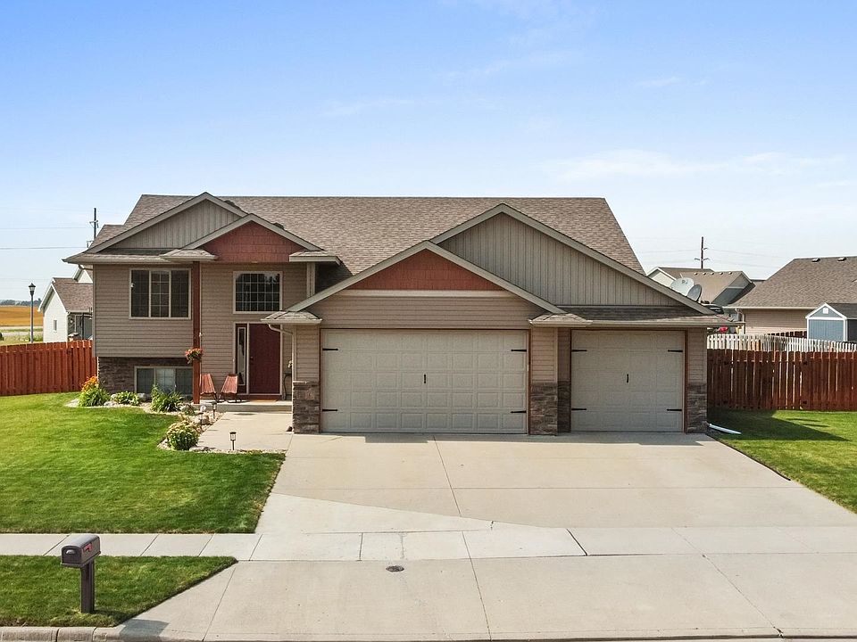 This home will check all the boxes! From the moment you pull into the driveway you will fall in love with this well cared for home. Notice the great curb appeal and nice landscaping, with underground sprinklers for ease of watering. The home sits on a large corner lot at an angle to allow for a huge fenced backyard. The red gables compliment the stone siding accents and landscaping. The soffit lighting will help set the look during the evening. Entering the home, you will be in the spacious foyer. Heading upstairs, you are greeted with beautiful hardwood floors(kitchen, dining and living areas) and an expansive vaulted ceiling which helps to encompass the open floor plan. The kitchen is to your left and features ample cabinet and counter space, stainless appliances, tile backsplash, recessed lighting and a large island for casual dining. The formal dining area is conveniently located off the kitchen with access from here to your 12 X 14 deck. The living room is a very comfortable conversation area. Heading down the hall you will find a full bath, three bedrooms, one of which is the primary suite. Here you will see a huge walk in closet and a 3/4 bath with dual sinks. Making your way downstairs you will enter a huge family room area with space for multiple uses, a 3/4 bath with tiled shower and two more good sized bedrooms. Finishing off the lower level is the laundry/storage/mechanical room. Check out the 3 stall, heated garage with floor drain. Don't miss out. Call your favorite agent today to schedule a showing.