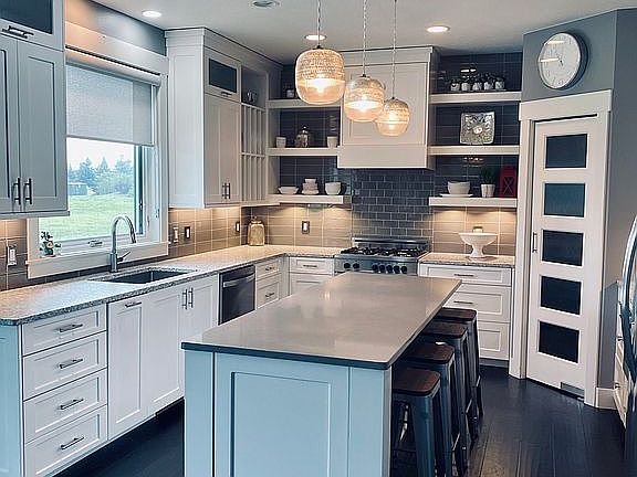REALTORS Welcome This modern craftsman, two-story custom-built open concept home is in Promontory Point, NW Bismarck. This house is unlike any other you have ever seen! Soaring ceilings, hardwood floors, sparkling tilework, magnificent lighting, white trim, and a neutral grey color palette throughout. When you first walk inside the house, you'll be greeted by the stunning, sweeping staircase. A As you enter into the open, vaulted living room, you'll find a stunning mezzo fireplace, as well as customized floating decorative shelving and cabinetry for plenty of storage. To the left of the entrance is the main floor office with 5 window panel door and large window to the front of the home. The living room opens to your custom dream kitchen. It features beautiful white cabinets, stunning tile work, quartz countertops, incredible lighting, and a large island with plenty of seating. You will love cooking on the high-end Bertazonni gas range. The walk-in pantry features counter-tops and electrical plug-ins for additional storage and counter space to hide your extra appliances. Located right off the kitchen is a huge mud room with custom cabinets, hooks and bench, a half bath, and garage entry. It connects to the spacious laundry area, which features a tiled floor, sink, and overhead custom cabinets. Your east-facing master bedroom with walk-in closet and bathroom with barn door entry may be found upstairs. The master bathroom has a stunning glass-doored, tiled shower, heated floors, custom white cabinets, and gorgeous quartz counters. Upstairs you'll also find two additional large bedrooms and a complete bathroom with double sinks. The basement in this home is ideal for entertainment, hosting guests, or housing teenagers. There are two bedrooms, each with a huge closet and large windows for plenty of natural light. There is a full bathroom with custom cabinets. The 100" projector screen and mounted projector are ideal for movie nights! There's also a bar/kitchen space in the basement with a full-size refrigerator, microwave, and deep sink. This five-bedroom, four-bathroom home has a 3+ stall oversize garage- fully finished, heated, H/C water and floor drain. There is a built-in security system. Whole-home audio throughout the house (including the garage and covered patio). Entry to the backyard can be found off the kitchen. A large sliding glass door leads to your covered cement patio. There is a gas line for the outdoor grill. The exterior features Hardie board siding and oversize, black Pella windows with high-end Hunter blinds. The yard is fully landscaped with ten large trees, sprinklers, and dry riverbed rock areas in the front yard. This gorgeous property will be a joy to live in and entertain in. This OUTSTANDING residence is a MUST SEE.