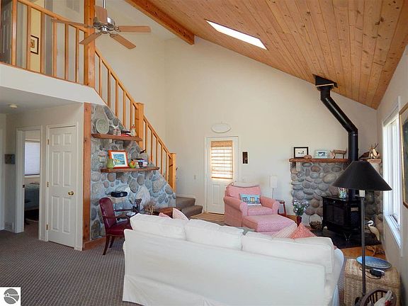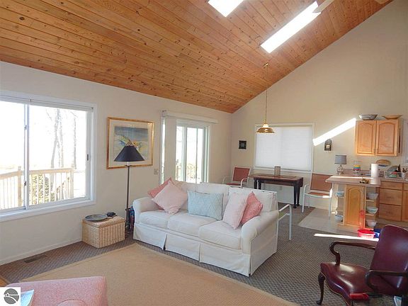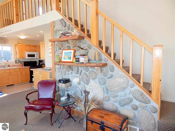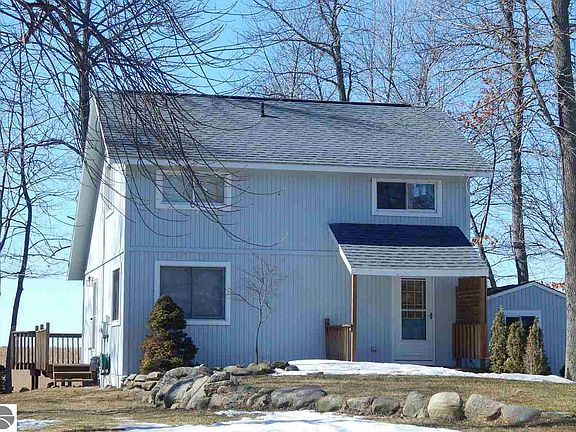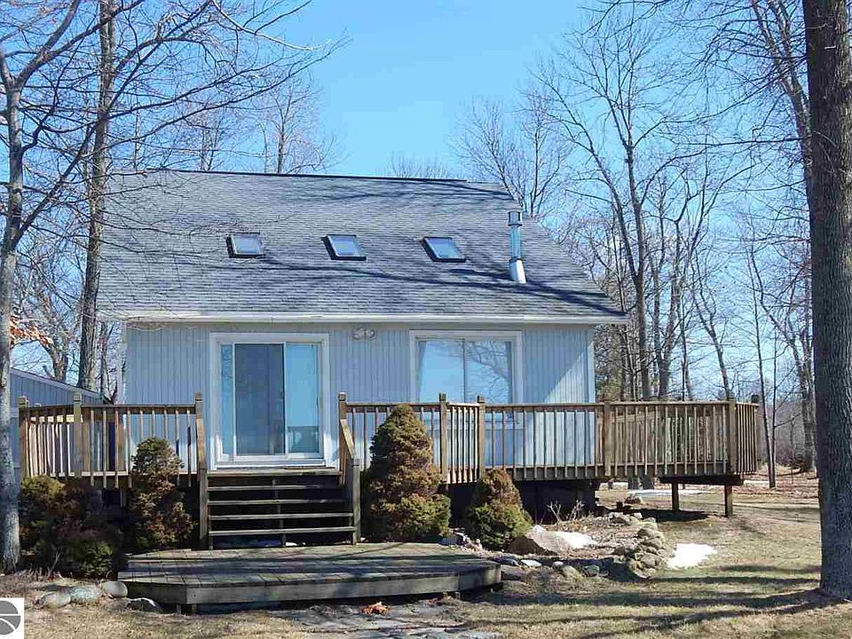 This is a newer build (1995) fresh appearing home with 69' of Lake Huron frontage. The home has great views from the living room, dining room and 36'x12' lakeside deck of the Lake Huron natural growth frontage with accompanying wild life and bird activity. The lakeside half of the home encompassing living, dining and part of kitchen has a two story vaulted knotty wood ceiling with three skylights giving the entire home a bright appearance. The great room has stone accents in two locations, including behind the gas wood stove fireplace with blower. The home has a great design for year round living or for the up-north get-a-way. It is located nearby a public access sandy beach, golf courses and a local winery. This is a great price for a newer attractive home with Lake Huron frontage.