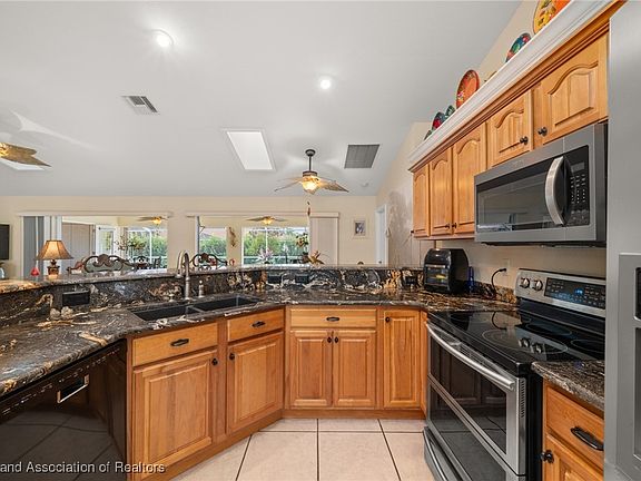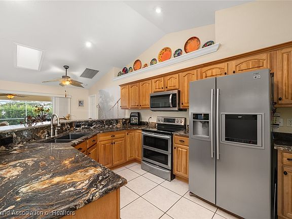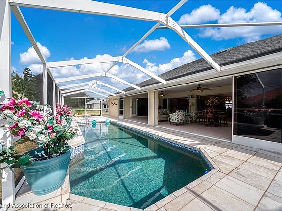 SHOWINGS & BACK UP OFFERS ENCOURAGED. You’ll want to see this home! Open floor plan with a “WOW” factor and gorgeous views of the pool. Bright & spacious, boasting just under 2,800 square feet of living space with cathedral ceiling and new blinds in 2024. Beautiful kitchen overlooks main living area and features high-end granite countertops, breakfast bar plus new top of the line stainless steel appliances. Large master bedroom with pool access and spacious ensuite with two separate vanities, double closets, tub and a water closet. Your family or guests will enjoy the extra privacy of the pocket doors leading to the bedrooms and bathroom. Expansive Florida room, under air, with pocket-like sliding doors leading to pool area. Pool is pebble tech finished 4-5 years ago with life time warranty. Utility room has new washer and dryer with ample space with cabinets and a closet. Generously sized garage with all tile floor, skeeter beater, golf cart entrance and attic access.