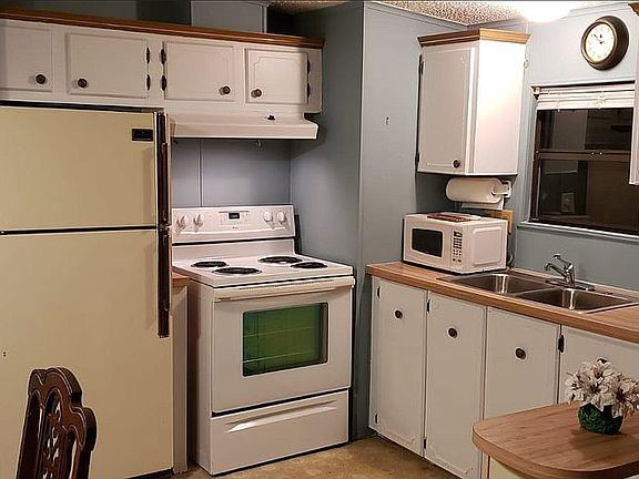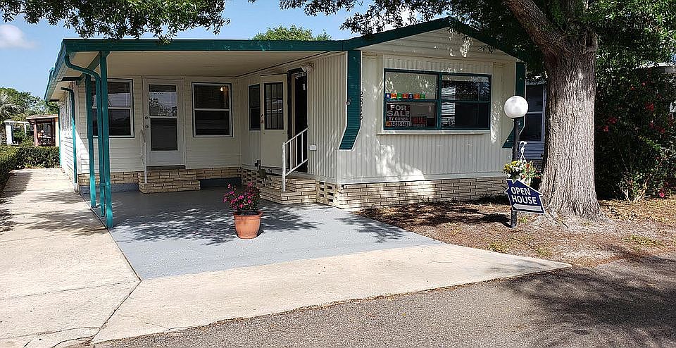 Furnished 2 BR 1 BA 1988 Home with 2 Additions featuring 967 SQ. FT. under central AC, Mostly Laminate flooring, Large 13 X 21 Primary Bedroom and 12 X 17 Guest Bedroom. Good Size Kitchen and Table Area, Bathroom has Nice Step In Shower and upgraded Toilet,Covered Carport with Golf Cart Path along side to Double door 13 X 13 shed. Home is on a quiet street in a 55 plus park with multiple amenities and lake with great sunsets.