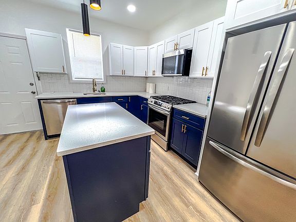 Inside, you'll find brand new finishes throughout including quartz countertops, custom cabinets, and designer tile work. The home features stainless steel appliances, central heat and air, and PVC flooring on both levels for a clean, modern look. A washer and dryer are included for your convenience.