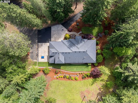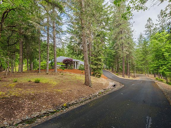 For the first time ever, the stunning estate at 28163 Skyridge Dr, is for sale! A scenic drive through gentle countryside, mere minutes outside of Eugene, brings you to the long looped driveway, and into serenity of the forest. Privately settled among untouched, and unbuildable community acreage, this home offers you a luxurious a wooded retreat. The manicured lawns in the front and back serve as a graceful transition from wilderness to home. Experience the peace and quiet within the solid walls and 14' high ceilings, fitted with a warm gas fireplace, and large granite counter topped kitchen. The many rooms offer a space for everyone, including an office with custom glass french doors, the formal dining room, a main level primary bedroom, with it's own travertine en-suite, jetted soaking tub, walk-in closet, and bedrooms near and far! Your hobbies, collections, and creativity all have a place here, too, with multiple storage closets, and separate utility room. Don't want to park the lawnmower in the garage? No problem! Attached to the extra deep 2 bay garage, you will find additional parking and storage with drive-in access from the back yard. The covered back patio is perfect for a quiet morning, for gathering with loved ones, and enjoying the slow tranquility of home. For a little more action, challenge your guests to a game or practice your three-pointers on the private basketball half-court.Pride of ownership sings from the vibrant, healthy, flowering native plants, into the carefully maintained home, and throughout the gentle sloping forest surrounding. This home is ready to be the place you experience your next chapter!