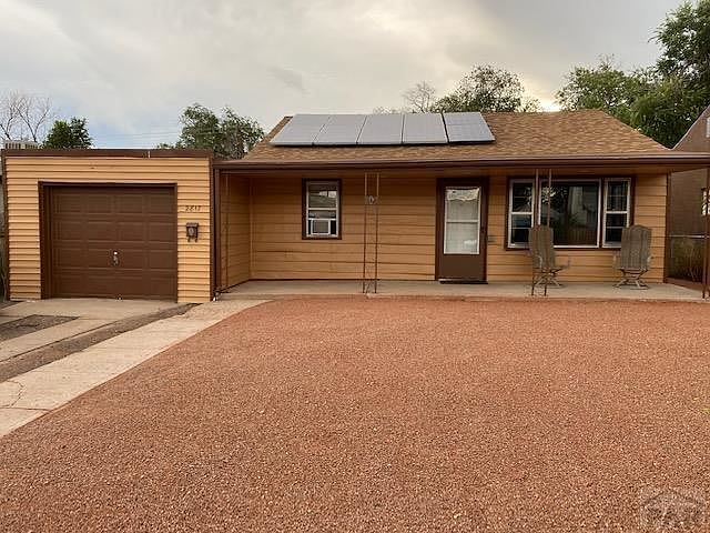 Back on the market. The previous buyers loss is your gain. This adorable two bedroom one bathroom house with new furnace and water heater is move in ready. Large covered patio on front of house for enjoying those summer porch days. Solar panels owned but not currently in use, in working order and new panel is ready for installation. Roof less then five years old with new gutters on back of house. Nice lot with plenty of room for your garden. Newly landscaped and well manicured back yard ready for your next gathering easily accessed from sunroom with newer patio door. Shed has been made into a work shop and hosts 110 and 210 electrical. This is a must see and won't last long. One car garage has custom made shelving for extra storage. Schedule your showing today. Outside agents must call Pueblo Association of Realtors and get a day code.