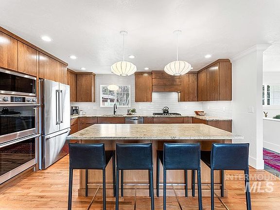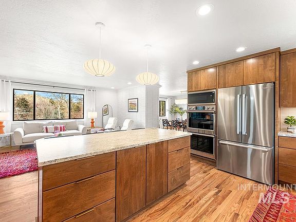 Revitalized mid-century modern architecture in a prime Highlands locale! Rich in classic MCM character, a style known & loved for its clean lines, simple elegance, & warm earthy tones. Recently renovated, this sophisticated space is elevated by thoughtful design & updates. Original flagstone & wood flooring, slim brick fireplace, & large picture windows add organic aesthetics & texture. The masterful kitchen remodel features slab-front wood cabinetry, stunning leathered granite countertops, high-end appliances, and Nelson saucer bubble pendants. Three main-level bedrooms and 2 additional lower-level bedrooms provide versatility. A walkout basement w/ bonus room, home gym, & spacious laundry room complete the home’s many flexible, functional spaces. Rare for the area, a sprawling, flat backyard includes hot tub, RV parking, & cedar shed - a potential sauna! Own & thrive in this prime area, with highly-ranked schools, Crane Creek, Hyde Park, miles of trails, & Camels Back Park just beyond your front door.