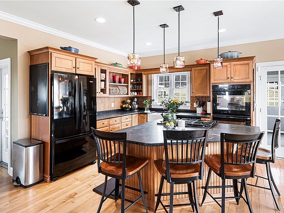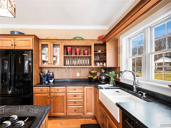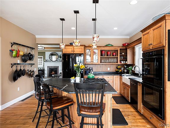 Custom built Colonial on over 15 acres with amazing country views with in-ground pool, pool house, walking trails, and waterfalls. The home offers four bedrooms, three full and one half baths, gourmet kitchen, island, soapstone counter tops, hardwoods throughout, family room with double sided Rumford fireplace, spacious office with built-in desks and sitting area, formal dining room, mudroom , and full bath with laundry. The second level has a Primary suite with California closet and full bath with tub and vanity. Three other additional bedrooms and full bath. The property has a detached two car garage with carport and workshop. The views are breathtaking of the county side with fruit trees, raised bed gardens, paved basketball court, electric charger in the garage for electric car, and new geothermal furnace and A/C installed in 2020. All located in the award winning Skaneateles School district with amazing sunsets.