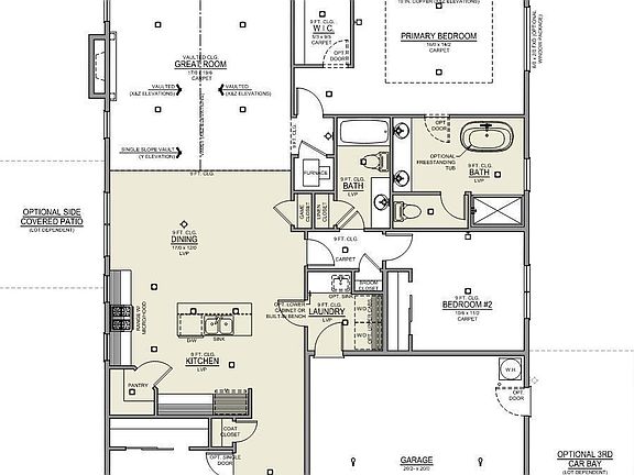 - Double Vanity, Enclosed Toilet(s), Granite Counters, Kitchen Island, Linen Closet, Open Floorplan, Pantry, Primary Downstairs, Shower/Tub Combo, Smart Thermostat, Soaking Tub, Solid Surface Counters, Tile Shower, Vaulted Ceiling(s), Walk-In Closet(s)