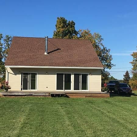 Newly remodeled house sitting on 5 acres full of beautiful views from 3 sets of sliding glass doors , newly painted walls, partially furnished, vaulted ceilings and balcony, very open floor plan, 3 bedrooms, 2 full baths- new flooring and furnishings, ceiling fans, beautiful fireplace divides the living room and dining room, new kitchen flooring, full basement, washer/dryer included, 1 car garage, price includes lawn care.