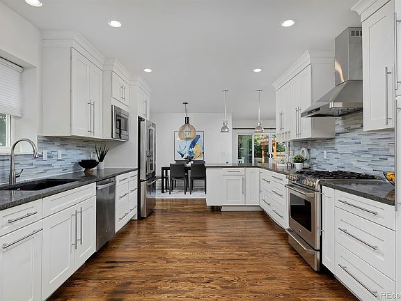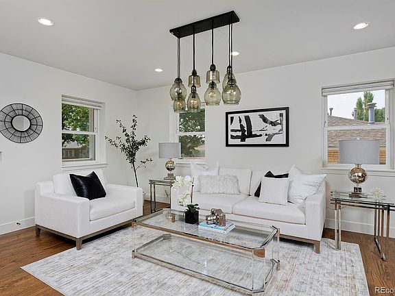 The absolute perfect blend of style, space and location finally flow together. Solemnly situated on your own oversized lot, you’ll find a newly painted, masterfully remodeled and expanded home that shines—from its classic, covered front porch to its idyllic backyard with shade trees, a wood deck, a pergola, privacy walls, a stamped-concrete patio and a firepit perfect for evenings under the stars. At the heart of the contemporary, open floor plan is a gourmet kitchen complete with stainless steel, high-end appliances, to-the-ceiling white cabinetry, wood floors and a breakfast counter with built-in shelving. It integrates seamlessly with the spacious living room and its stunning, built-in entertainment console wall by California Closets. A convenient, first-floor office is just off the living room. Upstairs is your large, tranquil primary bedroom, with a pair of walk-in closets and a soothing en suite bath, with luxe tilework and an all-glass shower. Two additional roomy bedrooms, a pristine bathroom and a laundry room complete the second floor, which boasts new carpeting throughout. The impeccably finished basement offers added flexibility with a guest room, full bath, and second living room or rec room. Say goodbye to electric bills, thanks to paid-off solar panels. Enjoy EV car charging plus ample off-street parking. And rest easy for years to come under a brand-new roof. This absolute knockout of a property sits two blocks from the beloved Sloans Lake, a true gem in the city with mountain views, boating, paddleboarding, tennis courts, ball courts, playgrounds, fishing and trails minutes from your door. Easy proximity to downtown Denver and the shops and neighborhood eateries, Highlands Square and LoHi nearby make this one of the city’s sweetest spots—plus you’ll love easy access to the airport to the northeast and Red Rocks Amphitheatre and skiing to the west.