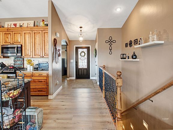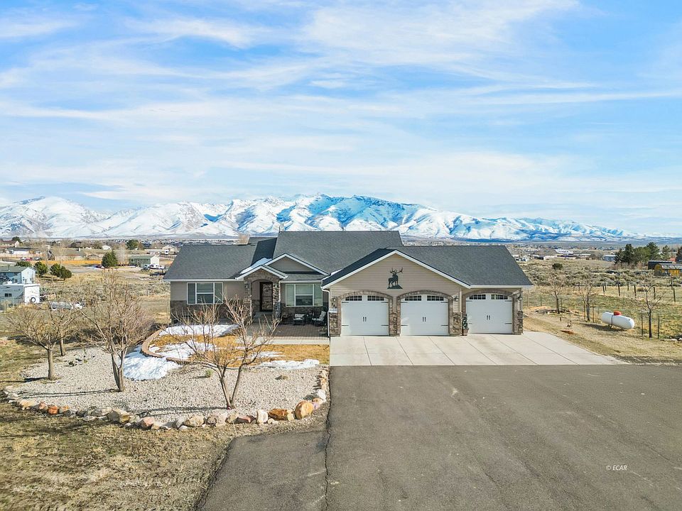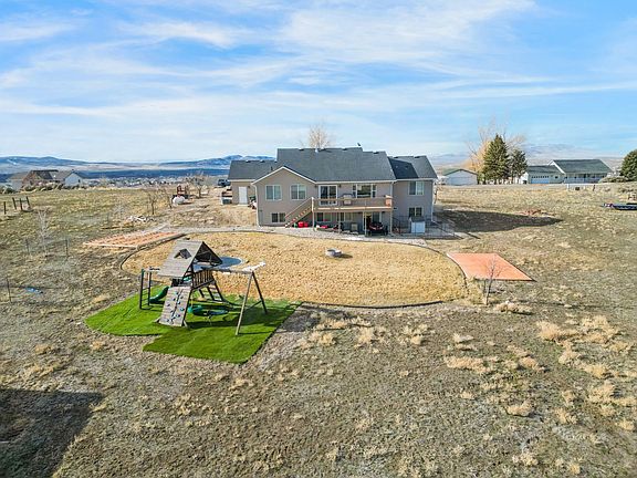 Welcome to this stunning Billat built home! Offering breathtaking mountain views and an expansive, walk-out basement with the potential to add 3 more bedrooms and an additional bathroom, this beautifully maintained property will not disappoint! Inside, you'll find a thoughtfully designed open concept, split-bedroom floor plan, with a cozy pellet stove, updated flooring, soaring vaulted ceilings, and a dedicated office perfect for remote work or study. The kitchen boasts beautiful cabinetry, 2 large pantries, and a huge island perfect for entertaining. The primary bedroom is also very large and the on-suite is well-appointed with a soaking tub and walk-in shower. Outside you'll appreciate the paved driveway leading to the massive oversized 3-car garage, mature landscaping, fruit trees, covered patios with pavers, and all the fun of a fire pit, in-ground trampoline, play-set with turf, pool deck, dog run, and deck that is already plumbed for your BBQ, perfect for summer nights! This home blends style, space, and convenience in a truly desirable setting. Whether you're enjoying the mountain views or taking advantage of the room to grow in the basement, this home cannot be beat.