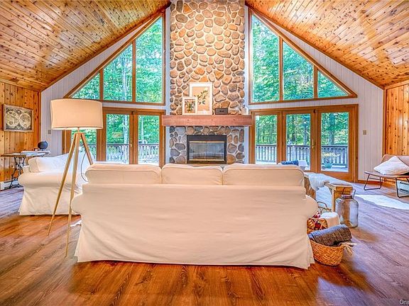 A huge living room with cathedral ceilings, a wall of windows, and stone-clad fireplace is the perfect centerpiece for a year-round country getaway. A large deck off the living room, a smaller one off the open kitchen, and a substantial breezeway add significant outdoor living space that s surrounded by a fern-filled, light-dappled woodland. A wood stove between the dining room and kitchen adds warmth to this cozy corner of the home. Recent renovations include new flooring, kitchen counter, light fixtures, and a water filtration system. The large bathroom off the extra-large primary bedroom was gut renovated, and that suite also includes a walk-in closet and many windows looking out to the woods. With two more good-sized bedrooms, a second full bath, and newly-finished attic, the house can hold a lot of guests - and there s plenty of room for entertaining both inside and out. Minutes to the Delaware River, there s hiking and boating galore, plus it s 15 mins to the Port Jervis station.