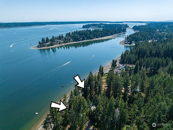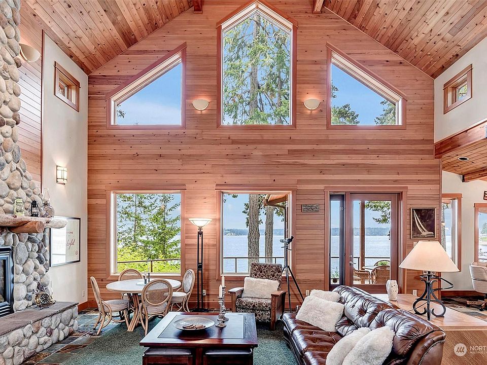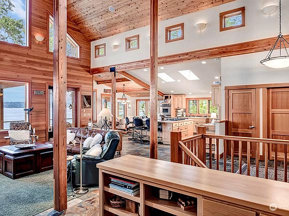 Fabulous waterfront home designed & built for thoughtful easy living. A private park like circular driveway. The front boasts an amazing outdoor kitchen & patio. Enter your dream home w/soaring ceilings, rock fireplace, large cozy spaces w/expansive views of Puget Sound & Mount Rainer & large water side deck. Gourmet kitchen designed for entertaining. Primary bedroom w/view, walk in closet, 5 piece bath & opens to deck. 2nd bdrm on main w/full bath. Laundry & 1/2 bath on main level. Aluminum clad wood windows. Daylight basement w/fireplace, wet bar, game area, 3rd bedroom & 3/4 bath. Deck at beach/boat ramp/easy steps to beach. The property extends beyond the fence on the south 107 feet, securing 3.37 acres of privacy. ADU above 2nd garage.