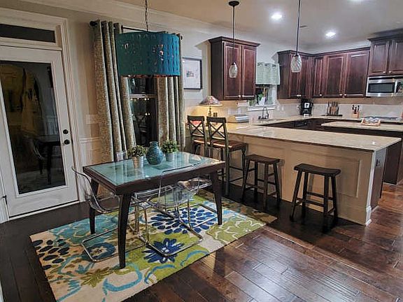 - RoomKitchenFeatures: Granite Counters, Pantry, Recessed Lighting, Eat-in Kitchen, Floors-Hardwood, Cabinets-Stained, Bar, Backsplash-Tiled