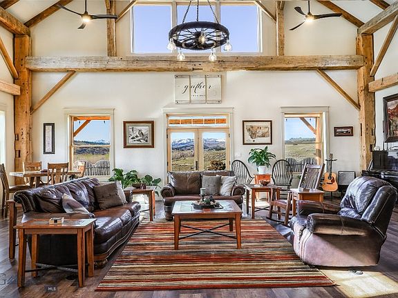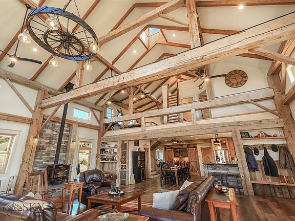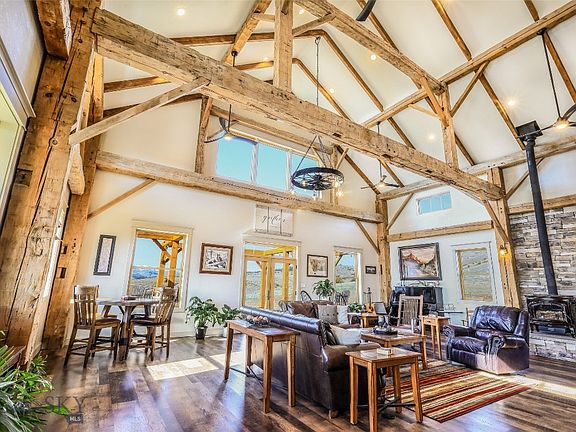 The heart of this custom home is an historic timber framed barn originally built circa 1840. Completely and carefully restored, the massive hand hewn beams in the expansive great room set the tone for the refined rustic interior. The home has 5 bedrooms, 3.5 baths, a master suite with a luxury bath, sitting area/office and coffee bar. Situated on 16 acres a few miles east of the town of Big Timber, Montana. Panoramic views of the Beartooth mountains, Gallatin National Forest and the valley greet you out every window. Just a one hour drive from Billings and Bozeman, it’s hard to beat the combination of convenience and seclusion this property offers. Much care was taken in design and construction to maximize the home's energy efficiency. Equipped with in-floor radiant heating, a beautiful wood burning stove, propane heat stove. The property has an RV pad with full hook ups, as well as a 12x24 building that could be finished as a guest house or office.