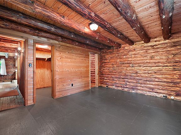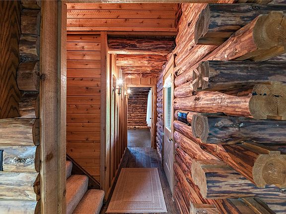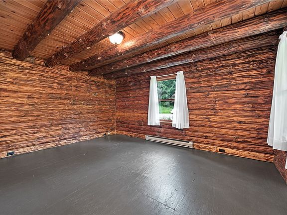 Features include: A great room with cathedral ceiling, full front porch overlooking the woods, first floor master bedroom and bath, newly re-shingled roof, cleaned and treated logs, poured concrete basement stairwell.The property is equipped with a fully functioning septic system and a strong, deep-drilled well. The well water is treated, soft and abundant. The home is currently all-electric and is wired for 200 amp electrical service, supplied by a dedicated primary utility circuit. Natural gas is available as well as a city water tap on Merriman Road.