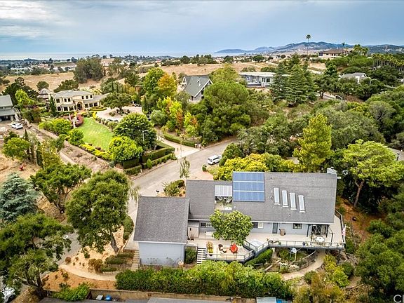 Your dream home awaits! This stunning, solar powered view property sits high above the Historic Village of Arroyo Grande with designer upgrades throughout. It's unique A-Frame design showcases a rustic tongue and grove ceiling with open beams, abundant natural lighting and views from all angles. Featuring 4 bedrooms, 3 full baths, a loft, plus a private, large bonus space ideal for a home office or home school space and separate Guest Quarters with its own private entrance which is ideal for an additional family member or rental opportunity. The kitchen has quartz countertops, custom drop lighting, bar seating, custom cabinetry with pull outs, large sink along with a separate hammered metal wash sink and stainless appliances. 2 master bedroom suites, 1 on the main floor and 1 upstairs, each with its own remodeled bathroom. You'll fall in love with the plank wood floors, stone floor to ceiling fireplace and open floor plan along with an exterior wrap around view deck. Relax in the jetted hot tub and soak in the peaceful surroundings. The property is nestled with mature oaks and various areas to establish your garden favorites. With fresh exterior paint, this home is move in ready. Plenty of off street parking with a 2 car garage, extra side space and paver drive space. Close to local restaurants, tasting rooms, wineries and a few short miles to nearby beaches. Virtually tour this property in the link provided above and schedule your personal tour today.