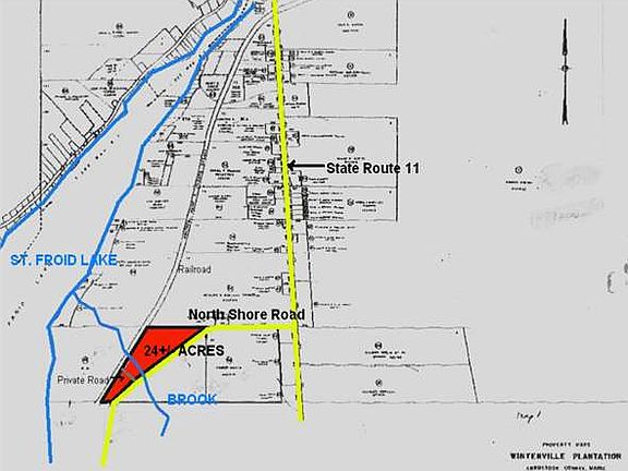 24 Acres of beautiful, heavily wooded land located off paved North Shore Road in Winterville, Aroostook County, Maine. The frontage on North Shore Road is approximately 2625 feet. The rear of the property is approximately 1700 feet. The width on the south is approximately 312 feet and width on the north is approximately 2530 feet The land is located just minutes from the Canadian Border, and roughly 1200 feet from County Road 11 (Aroostook Road.) There is a small stream that traverses the property and leads to the very popular recreational Saint Froid Lake. The triangular shaped land has over 1500 feet of road frontage on North Shore Road and is secluded from the hustle and bustle of the more developed areas of the Count Winterville (also known as Winterville Plantation) is a small town whose 2010 population was 261 with 224 homes, representing a density of just 5.5 people per square mile. It is known as a four-season recreational area. A quaint town where family and neighbors are important. The land is just minutes away from retail shopping, restaurants and recreational activities including the Canadian Border Crossing. There is no home owner's association fees and taxes are nominal at just $137.50 per year.