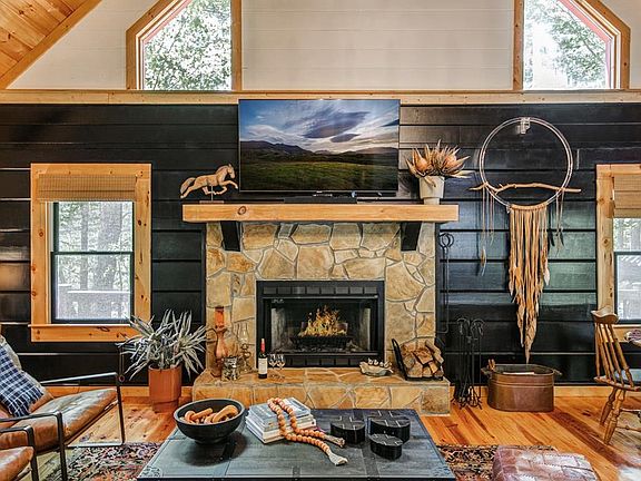 This luxurious cabin with mountain views is professionally decorated and furnished! With 3 bedrooms, bunk area, 2 living rooms, loft and 3 full bathrooms, there's plenty of space for family and friends. Enjoy the main and lower living rooms, a play/bunk area, a cozy loft, and a dining space perfect for gatherings. Featuring cathedral ceilings, genuine log construction on the main level, and a stunning stone fireplace, this updated cabin blends modern comfort with rustic charm. Warm up by the fireplace or enjoy the firepit outside. Year-round mountain views from the back porch overlook the gently sloped yard. Your mountain dreams await! Close to hiking, fishing, and boating!