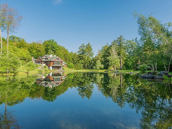 Just outside the quiet village of Dorset and set against the backdrop of the Taconic mountains, this 20+ acre property reflects the pursuit of a slow, intentional existence with a connection between the living space and the outdoors. Charles Sawyer, the architect, drew from an Adirondack stylebook, integrating Douglas fir and native stone to create a sophisticated 5 bedroom dwelling. Sited at the water’s edge of a large pond; the design takes in the views from the Great Room's expansive windows, from the spacious screened-in porch and from the first floor primary bedroom. Outside the upper stone terrace provides a lovely setting for summer suppers and the lower stone terrace, a hub for pond activities. The pond, generously fed by a well and spring, is stocked with trout, and is big enough for a paddle in a canoe and refreshing daily swims. A path runs along the Mettawee River on the NE border, another loops around the pond and there are adjoining trails to explore including into the village. Gather friends and family for a spirited game of hockey on the pond or snowshoe on the trails. Everyone can warm up beside a crackling fire in the stone fireplace in the Great Room, a perfect setting to reflect on the day's adventures. In addition to perennials, there's an edible landscape of asparagus, blueberries, apples and pears. Rounding out this slice of heaven is a greenhouse, sauna, rec room, office, gym, 2 bay garage and barn. High speed internet. Delayed Showings until 07.07.23.