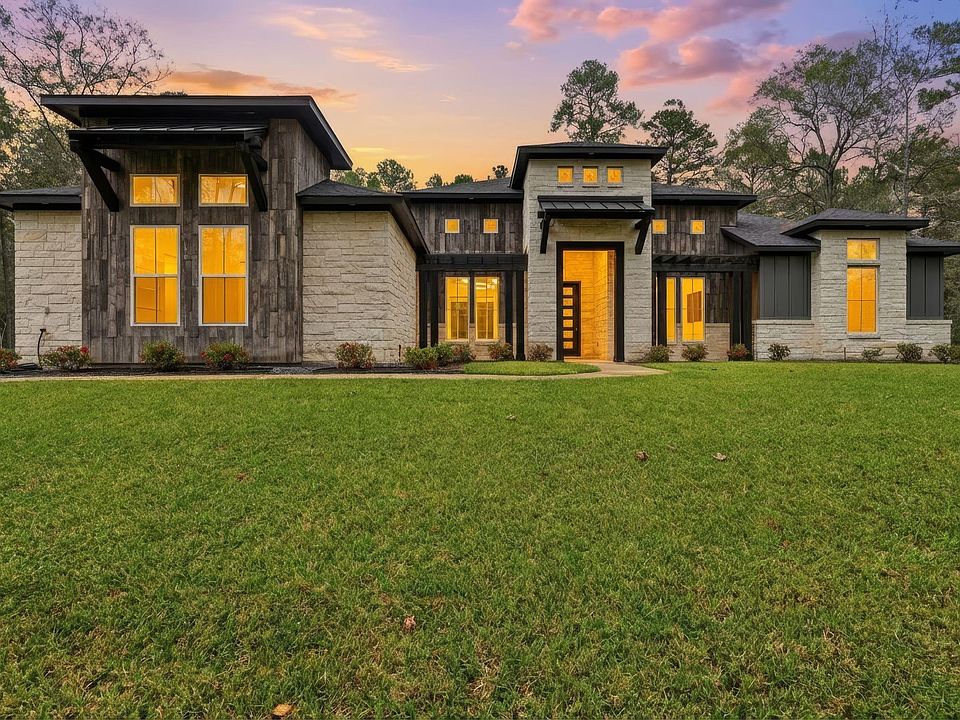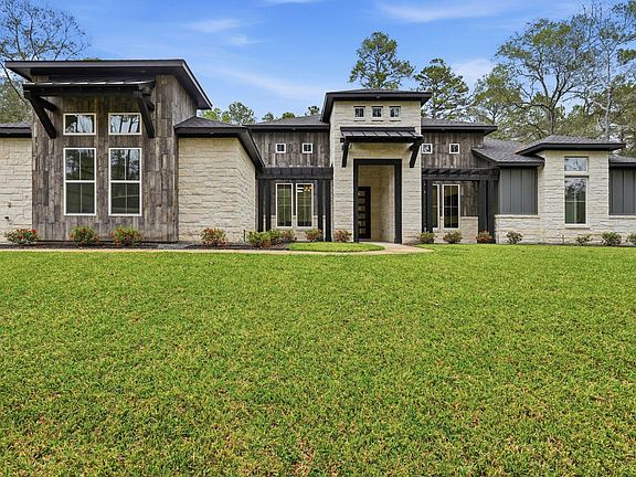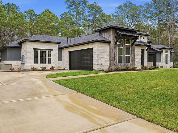 Cotemporary one story home in the forest! Stunning 3 bedroom, study, formal dining home located on the highly desirable acreage community of Texas Grand Ranch. Features wood look tile floors, modern lighting, cased windows, vaulted ceiling with beams, lots of large windows and open living for entertainment. Kitchen with built in refrigerator/freezer, convection microwave, stainless steel appliances, quartz countertops, Thor double oven range with 6 burners and griddle, under cabinet lighting and walk-in pantry. Split floor plan with 2 other bedrooms & full bath & double sinks. Study with tray ceiling & beams. Primary bedroom with door to private patio, tray ceiling & beams, spa like bathroom, barrel ceiling, gorgeous chandelier, large shower with beam details, double sink & freestanding tub. Laundry room w/ lots of cabinetry & dog shower! Serene back patio looks out to crystal blue pool, fire pit and large workshop barn that has electric & insulated. Generator & spray foam insulation!