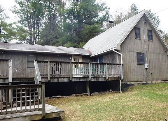 Charming Woodland setting Contemporary Home with large 1990s Addition incl Master Bedroom and Bath, Family Room w/ fireplace, Laundry rm ; large Deck. Main house circa 1970 -Living room w FP, Eat in Kitchen, 1st fl Bath w shower; upper level - 2 Bedrooms w/ lovely woodland views. The 118 acre parcel is a mix of open land and woodland, a very private setting with nature all around! Includes a detached 2 car Garage with storage, workshop area.Lake rights at Public Landing Springfield