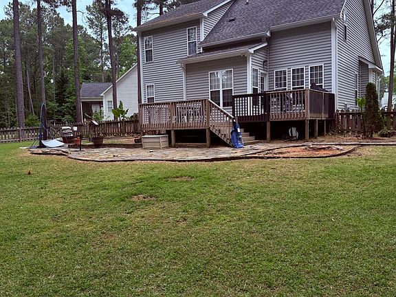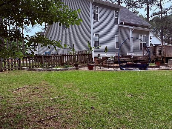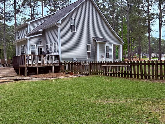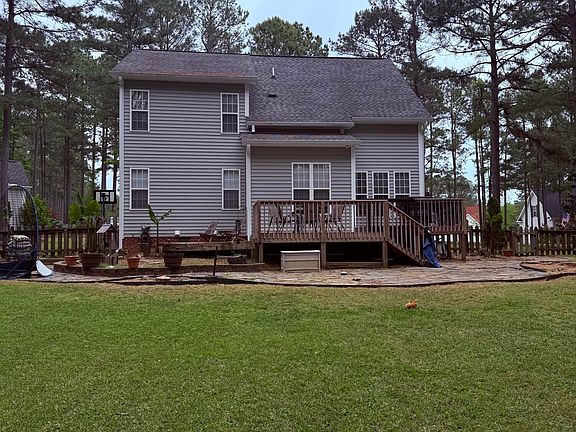 You must see this picturesque beautiful home with Primary/Master Suite down, 3 bedroom w/Bonus Room that has a closet which could be used as a 4th bedroom plus another flex room upstairs! This home offers serene country living and is located on a large .88 acre lot at the end of a cul-de-sac in the lovely, family friendly, and desirable Wyndom Knoll Subdivision in the countryside of Angier! Step onto this beautiful rocking chair front porch overlooking the beautiful yard with soaring trees, beautiful flowers and lush green grass and then walk into the front door and find soaring 2-story ceilings in the living room with a beautiful fireplace w/gas logs which opens to a formal dining room, an eat in kitchen and walk down the hall to your wonderful roomy primary bedroom suite with ensuite 2 vanity bathroom, a large jetted tub and a separate shower plus a large walk-in closet. The laundry is downstairs conveniently located near the primary suite and living area. There is a great 2-car garage for your cars and extra things. Walk out from your kitchen onto the large back deck and step down onto your flat and grass covered back yard with a fire pit, a tether ball court area and more all on this beautifully landscaped yard! This home is conveniently located approximately 5 minutes to shopping, schools, 6 minutes to I-40, 30 minutes to Downtown Raleigh,20 minutes to Garner and White Oak Shopping Center, 1.5 hours to Wrightsville Beach. Don't miss this fantastic home!