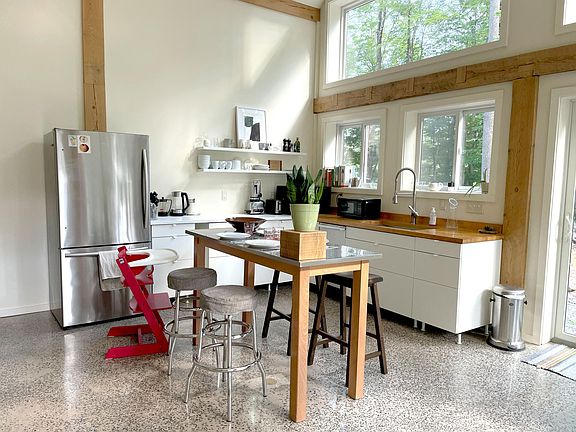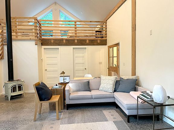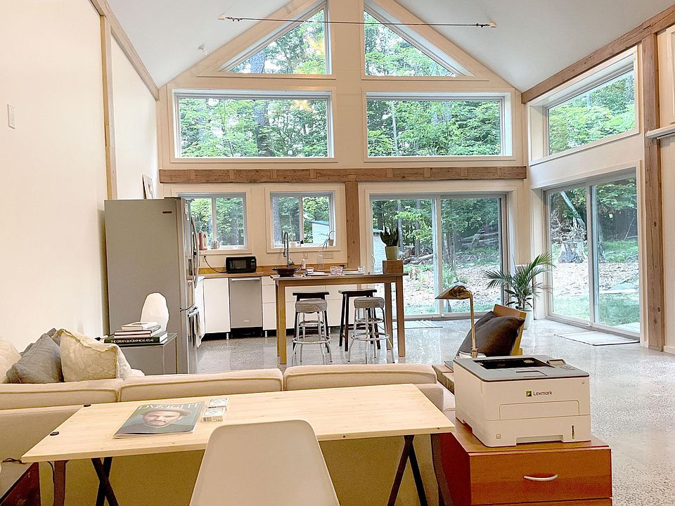 Welcome to your new Woodstock home. The Studio is an airy, spacious, timber frame with heated concrete floors, marble bathroom, and cozy spaces for rest and relaxation. With walls of windows, it will keep you connected to nature and is the perfect place to rejuvenate. The house has a relaxed easy calm about it. Sited beautifully on a hill on 3 wooded acres on the border of Woodstock and Bearsville. You will very much feel like you are living in the forest here, but several restaurants and the Bearsville Theatre are within walking distance. The Studio's AC makes it nice and cool for hot summer days. It has everything you need for the perfect getaway: Fully furnished Excellent wifi: you will have no trouble having simultaneous zoom calls and watching Netflix at the same time Cozy woodstove Desk 3 acres of land 5 minute walk to several restaurants and the Bearsville Theatre Serene and clean with soft sheets and fluffy towels Charcoal BBQ Well stocked, full kitchen We have a French press, electric kettle and coffee grinder Sleeps up to 4: 1 queen bed, 1 twin bed, 1 blow up bed. Pack and Play and high chair available on request. As of right now, we have a resident fox as well as deer that frequent the yard. It is not uncommon to see all manner of birds including wild turkeys. Though with the fox around, we see the turkeys less often! You would be hard pressed to find a space with more natural light. We specifically positioned the main house to optimize diffused light. The sunroom gets more direct light (it has blinds) and was originally designed to be an art studio but is currently set up for TV watching with one wall of windows and the other a long white, blank wall. This space could also be set up for additional sleeping quarters as the space is large, has doors on either end and is also sound proofed. The downstairs bedroom has a blackout shade and would be ideal for a baby / child who needs naps. If you are someone who needs to sleep in darkness, we can also move the queen bed into that room. We want to keep this a quiet and tranquil space. Absolutely no parites. There is a sound ordinance in Woodstock: you may not make noise outside after 9pm. Not to be taken lightly. Black bears are common all over Woodstock. To keep bears away, please do not leave any food outside. Tucked away on 3 acres, The Studio is a space where indoors and outdoors mesh. Walls of windows, polished concrete floors, lofted and airy. The space has a tranquil and easy going ambiance. This is a very special property and we are looking for the right tenants. No smoking