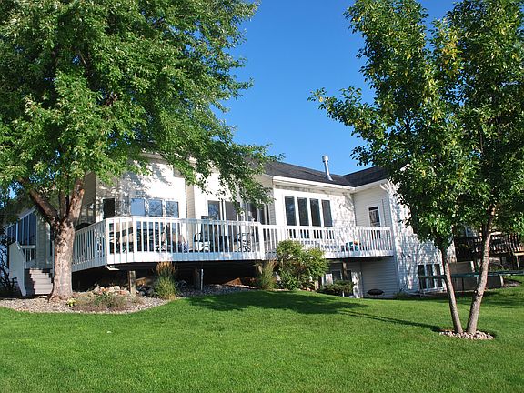 Lake living in the middle of town! This rambler is located in a quiet cul-de-sac in Bluemont Lakes, close to shopping and schools. Amenities include: Underground sprinklers, maintenance free decking, warranty on fridge and stove, gas fireplace, gas forced air heat, central air, custom windows for easy lake viewing and steel siding.