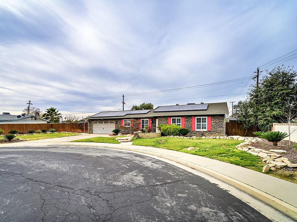This delightful 3-bedroom, 1.75-bath home offers both comfort and efficiency with owned solar (56 panels!) and a new $7,000 wood-burning fireplace insert, ensuring warmth throughout the winter. The 3-year-old HVAC system keeps the home cool for years to come.Situated on an expansive 11,400 sq. ft. lot, this property provides plenty of space for all your needs. The home features plantation shutters, ceiling fans in all bedrooms and the family room, and a beautifully updated kitchen with granite countertops and newer stainless steel appliances.Step outside to a spacious backyard oasis, complete with a covered patio leading to a gazebo wired with electricity and speakers, perfect for summer gatherings. The yard also boasts a garden area and fruit trees, including cherry, peach, plum, orange, lemon, and berries.Additional highlights: