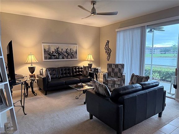 Don't miss out showing this unique open floor plan with the kitchen and living room overlooking the big lake and fountain. Brand new Whirlpool stainless appliances in the kitchen were bought in November 2024. The tasteful kitchen granite countertops were installed in 2024. All the interior fans were replaced. This condo faces east with the morning sun making it a light and bright condo for a first floor living at its best. NO STEPS. It is tastefully decorated in neutral colors and ready for your choice of furniture. Three community pools and walking paths plus a front and a back lanai and a detached garage for a very affordable bundled golf community in Naples Florida. Ideal location with shopping, banking, beaches and restaurants close by. This one will not be on the market long so hurry!