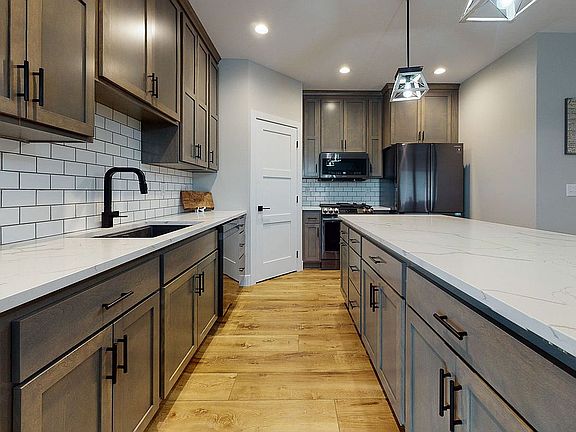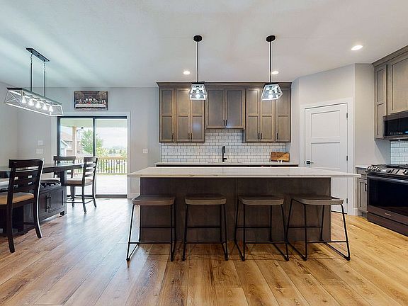 Like New Ranch Home built new in November 2021 on a large Cul-de-Sac lot with .32 acres in the Brandon School District. 5 Large bedrooms, 3 bathrooms, open floor plan on both levels, and 9ft ceilings throughout the whole home with security system. Large fully finished oversized 3 stall garage. Master bedroom is 15x17 with a walk in closet, dual vanities and sinks, and a 9ft long tiled shower with dual heads. The kitchen and Dining is open to the main floor living room and has a large center island with quartz countertops, custom cabinets, gas range, and a large pantry. Sliding doors off of the kitchen out to a huge covered deck with composite decking, speaker system, and gas hookups along with a deck off the front. Main floor laundry and lockers between the kitchen and garage. The garage is finished and heated with water hook-ups, floor drains, and epoxy floor. The basement has a huge family room, full wet bar, plenty of storage, 2 bedrooms with walk in closets, and a beautiful bathroom. Beautiful landscape, sprinkler system, and built-in stereo system throughout the home.