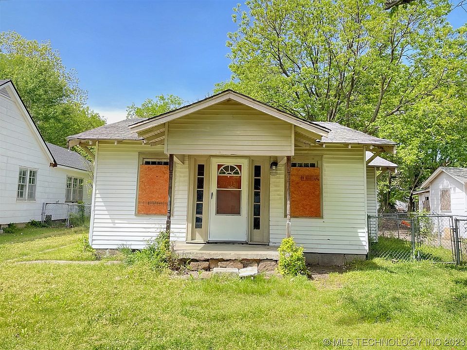 Situated on a quiet street, this bungalow has endless potential with its original hardwood floor and unique architectural details. With a little love and attention, this home could be transformed into a stunning vintage gem. Step inside and you'll find yourself transported back in time with original features such as crown molding, and spacious living room perfect for entertaining guests or enjoying family meals. The kitchen is a blank slate, waiting for the new owner's personal touch. The bungalow features two bedrooms, each with their own unique charm. The additional bedroom is spacious and perfect for guests, a home office, or a growing family. The backyard is a blank canvas, perfect for creating your own private oasis. Imagine hosting barbecues and family gatherings under the shade of the mature trees. Located just minutes from downtown Muskogee, this home is within walking distance of local restaurants, shops, and entertainment. It's also just a short drive to parks and other outdoor recreational activities.