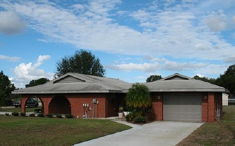 Cute and unique, this BRICK home on a large corner lot is just a short walk from pretty Lake Olivia, where you will enjoy beautiful Florida sunsets. Wood laminate and tile flooring in the living area for easy maintenance. The eat-in Galley kitchen has newer stainless stove and dishwasher, and a microwave over the stove. Dining room off the kitchen could also be a family room. Both bedrooms offer walk in closets! An indoor utility room makes laundry convenient. Lots of parking and storage with the DEEP two car garage (has single car door) and carport separated by a screened breezeway. The large back yard is fenced and has a 10X20 concrete pad for a shed or workshop. See this home today!