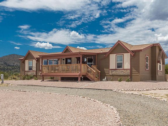 One of a kind beautiful 2015 Clayton home with breathtaking panoramic views on 1 acre in Chino Valley. Large kitchen with island and gorgeous cabinets, open floor plan and raised ceilings with a wall of windows to enjoy the views, living room plus den, four bedrooms and two full baths, heated AZ room, two outdoor living areas, large covered front porch/deck where the views are amazing, cozy rear covered deck. Plenty of space to park your vehicles and toys, horses & farm animals welcome, no HOA! New front landscaping with circular driveway. New working well and pump house with 2500 gallon water storage tank. Two large sheds. Country living in style and comfort. This home is immaculate and move in ready!