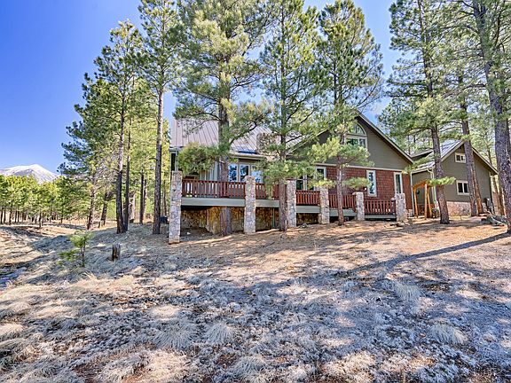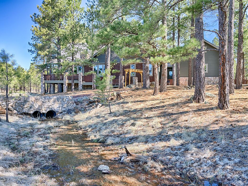 Large custom built with a truly open concept home on 2 acres with views of the San Francisco Peaks through expansive windows. Enjoy heavily treed acreage and a seasonal creek running through the property while viewing local wildlife. Sellers have spared no cost with high end remodel including quartz and granite counter tops, high end stainless steel appliances, upgraded light and plumbing fixtures, new flooring throughout and lifetime metal roof. Included in the 4 bedroom plus office 5 bath (3 full 2 half) home, is a large guest suite with fireplace and separate entrance. Large living spaces and Two oversized decks provide lots of entertaining space. Hike and stargaze from this very quiet backyard. Located less than 10 minutes from downtown and the Snowbowl entrance.
