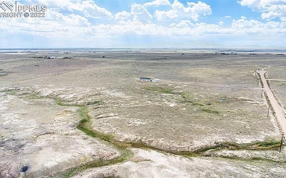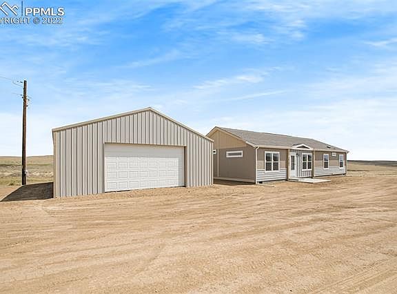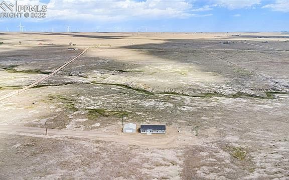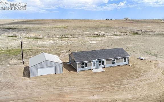 Built in 2022, this amazing 1880 sqft ranch style home sets on a 39.11 acre lot of tranquil prairie lands with breathtaking pikes peak and front range views. Entrance to this home opens directly to the open living room. Featuring a soothing ceiling fan and upgraded plush carpet, this room welcomes you with every step. The living room opens to the kitchen and dining rooms. This kitchen features a well-designed layout, upgraded stainless steel appliances, including a 21 cuft refrigerator, 30-inch gas/propane range, microwave, dishwasher, and farm style sink. Pantries on two sides of the kitchen insure you have tons of storage for food or your favorite gadgets. Between the kitchen and the walk-out dining room is a perfectly placed island. This helps separate the three rooms while maintaining a great flow. The islands granite top provides the perfect breakfast bar seating, with a bonus sweep-o-vac system built in. Finished in a gorgeous barn wood vintage linoleum, the kitchen and dining room floor offers the best of style and durability, which is continued in the adjoining laundry/utility area. Past the dining room, this home overs an expansive family room. This room offers a beautiful build-in entertainment center with electric fireplace, perfect for entertaining or a quiet evening watching with family. This end of the home provides two sizable bedrooms, finished in the same plush carpets as the living room and family room, and separated by a hall access full bathroom. The primary bedroom rests on the opposite end of home. This suite hosts a huge walk-in closet as well as a private bathroom with dual sinks and a walk-in shower. This property also provides a new 30x30 outbuilding with an 8ft overhead door and man door, as well as a newly drilled well and installed septic system. The second solar well pump was used for livestock when this area was a working ranch. This pump can be sold in addition or removed. The 39 acre lot east of this property is also available.