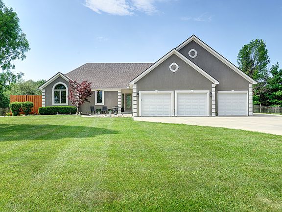 3,266 sq ft Reverse Story and a Half on 11 acres with easy access to highways, Smithville Lake and easy commute to downtown KC and surrounding areas. 4 Bedrooms, 3 Baths, Upstairs Laundry, Walk-in Pantry, Dining Room Custom Gourmet Kitchen with professional grade appliances, updated Master with tile shower and custom cabinets in walk in closet, new roof, new geothermal heat pump, new paint, ready to move in and enjoy. Detached 1800 sq ft finished outbuilding with Mother in Law quarters, kitchen, laundry, bath, new roof, new heat pump and car lift. Main Floor Master Bedroom: First floor Master with custom tile shower, Jacuzzi tub and large walk in closet with custom built in cabinets, shelves, make up table and a door to a private outside deck. Kitchen: Gourmet Kitchen remodeled in 2008 with Granite countertops, Custom cabinets, Professional Grade appliances, built in coffee maker and a raised counter with seating for 6 around wet bar. A walk-in Pantry and large laundry room with custom cabinets are near kitchen as well as a large dining room\hearth room combo including a vent free gas fireplace, door to raised wood decks and South facing windows with nice views of backyard and the woods behind. Bedroom #2, Hall Bath, Living Room, Entryway Lower Level Large Rec room with gas fireplace, two bedrooms, one bath and walk out door to 800 sq ft concrete patio with firepit. Outbuilding Poured foundation 36 x 50 with sprayed in foam insulation, Heat Pump (new in 2017), 432 sq ft Mother in Law quarters with kitchen, bath, laundry, and living area including a deck and separate fenced back yard. Large shop area with 10,000# two post car lift, shelves, and workbenches. Exterior Large concrete driveways in front of house and outbuilding with plenty of parking and turnaround area, 2 large concrete patios in backyard, 2 large decks, 1 acre fenced in backyard, nice established landscaping with over 4 acres of lawn and many mature trees.
