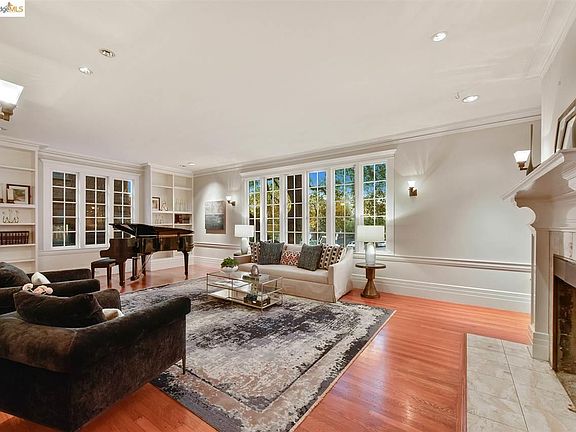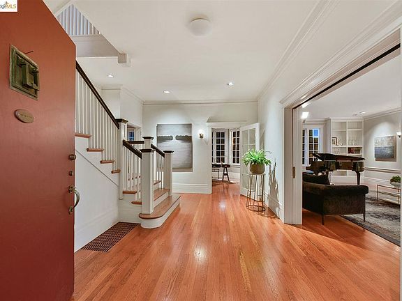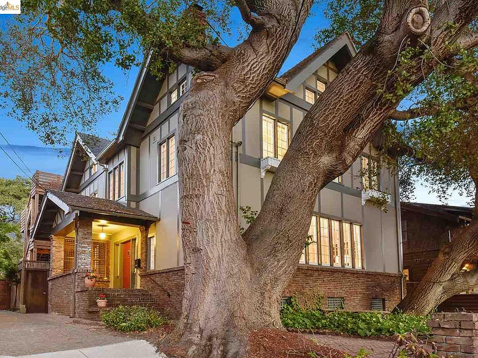 This grand Elmwood residence with sophisticated upgrades, exudes elegance and invites entertaining in- and outdoors. Designed by Frank Truman Swain + strikingly remodeled. A "great" living room with 10' ceilings, tall, multi-paned casement windows + a large fireplace. Study or library w. built-in shelves, dining room with fireplace + wainscoting, expansive remodeled sunny eat-in kitchen with 2 dishwashers, 3 ovens and marble counters all open to the large wooden deck and the large level garden for great indoor/outdoor flow. 4 BRs upstairs, including the master suite, w. beautiful fixtures, distinctive architectural features. A luxurious 3rd floor in-law apartment can be accessed internally or via its own outdoor stairwell - has a large wooden deck with beautiful views of the hills and the neighborhood. Long driveway with an electric vehicle charger. Rare opportunity in the Elmwood near shops, restaurants, BART, parks and the SF commute.