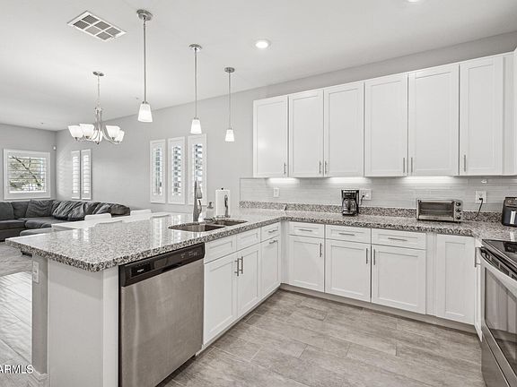 Beautiful end-unit townhouse in this gated East Mesa community! You will love the modern look & feel of this 3 bedroom, 2.5-bath home. All bedrooms & laundry area upstairs. The main level has a great room open-concept which showcases a stylish kitchen with white shaker cabinets, Luna Pearl granite countertops, stainless steel appliances, walk-in pantry, & elegant shutters throughout. This area is perfect for gatherings & entertaining. All bathrooms are upgraded with designer tile & accent tile details. Enjoy the community's heated pool & spa, playground, & ramada area. Included is an attached 2-car garage with built-in cabinets & overhead storage. Great location for travel access out of Mesa Gateway Airport, Superstition Springs Mall shopping & outdoor activities at Legacy Sports Complex