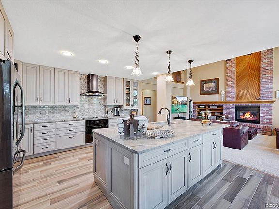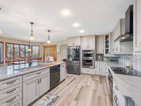 You will be so proud to call this GRAND HOME yours. The minute you're home, you'll be smiling at the style & UPGRADES in every room. It's a best-in-class street appeal with rock garden, covered front porch, painted earth tone exterior and new garage doors. Entering, you are WOWed by a 2-story foyer with stately curved staircase and large marble foyer. Ready to fall in love with your stunning NEW KITCHEN? New neutral-tone cabinets & lots of them! GIANT KITCHEN ISLAND topped with natural quartzite stone Gorgeous! Multiple ovens - built-in cooktop/oven, brand-new combo built-in oven with convection microwave oven, matching refrigerator. Beautiful wood look porcelain tile floor! This kitchen remodel is calling to that DREAM GOURMET chef in you. Ready to entertain at the holidays? The kitchen remodel has opened up the space to the huge family room with DRAMATIC HIGH CEILINGS and fireplace wall. Main floor also features a large study, formal living and dining rooms, 3/4 bath and that highly deserved drop zone/laundry/mud room adjacent to the garage. Retreat upstairs via open staircase to cozy loft, 4 bedrooms all with walk-in closets including that beautiful primary suite you want! Wait till you see it VAULTED CEILINGS, bay window looking out over your MATURE TREED LOT, spacious closet and tastefully remodeled primary bath, includes double vanity with granite countertops, lovely tile accenting jetted tub and tall frameless glass shower, plus heated Versailles style tile floors. In the finished basement, you'll discover a huge 5th bedroom, 3/4 bath and 2 recreation rooms. There is a wet bar in one rec room with area for a pool table & games galore. Check out the BIG, LEVEL BACKYARD with Trex deck. It's like being in the mountains in your own backyard. The home sits on just over 1/3 ACRE LOT right in the HEART of Highlands Ranch. CLOSE TO ALL THE AMENITIES, walking trails and good schools. Come see it and fall in love with the CUSTOM feel of this home.