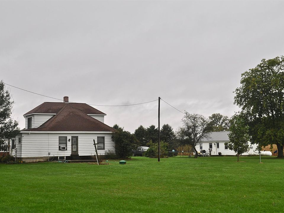 Truly a unique and great property surrounded by farm ground. This property consists of 2 homes, a 3 car garage (30x38) and a 30x62 outbuilding with concrete floor. The 3 car garage also has a concrete floor and is heated. The Main home has an enclosed porch, large eat-in kitchen, living room, family room, 3 bedrooms, utility room and a full bath.The guest house features a large open living room to the kitchen, 2 large bedrooms and a utility area and a full bath. This home has all newer drywall, electrical, light fixtures, kitchen, bath, flooring and a metal roof!This is a wonderful property that should be given some thought! It's a perfect set up for a mini farm!