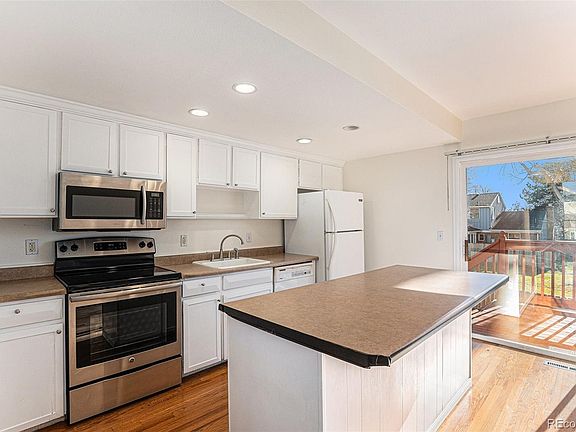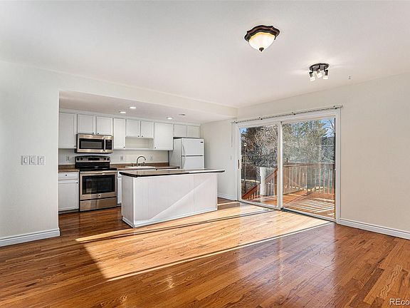 Welcome to this well-maintained 3-bedroom, 2-bathroom home in the sought-after Dam West Community, where elegance meets functionality. This charming home features vaulted ceilings in both the great room and main-level primary bedroom, hardwood floors throughout select areas, and fresh updates including brand-new carpet and interior paint. The primary bedroom boasts built-ins, an en-suite bathroom with tile vanity, and direct deck access, while the finished basement offers a versatile non-conforming fourth bedroom or office space. A wood-burning fireplace with charming brick surround adds character to the open floor plan, which is bathed in natural light. Step outside to discover a serene backyard oasis, complete with a patio and expansive deck, all backing to a picturesque greenbelt with walking trails that lead to Polton Elementary in the prestigious Cherry Creek School District. Residents enjoy access to exceptional community amenities, including a pool, clubhouse, tennis, and pickleball courts. Ideally situated just minutes from I-225, Parker Road, RTD, Light Rail, DTC, and Cherry Creek Reservoir, this move-in ready home offers the perfect blend of location, comfort, and convenience.