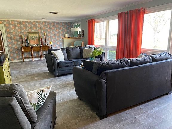 DECORATOR'S DELIGHT! Beautifully renovated t/o including totally NEW kitchen with new solid wood cabinets & hardware, subway tile backsplash, new deep stainless sink with new picture window overlooking acreage in rear, 5 burner gas stove, stainless refrig, microwave and dishwasher (appliances under warranty), fabulous 9 ft island with quartz countertop, new lifeproof luxury vinyl plank flooring t/o, kitchen overlooks breakfast area with masonry fireplace, large living and dining room with numerous new double pane windows across front, large master suite and master bath with new double vanity, mirrors and fixtures, subway tile tub surround, huge walk in closet, new hot water heater, new porcelain tile, new light fixtures and fans, all new windows, terrazo flooring in sunroom, large laundry room, screened rear porch, double carport, roof only 2 years old, huge fenced lot in rear aligned with huge beautiful oak and pines on sides and rear of property, double bay barn with new metal roof plus workshop. Quiet rural setting with great layout for animals. Ideal for those desiring easy access to Marine Base, Miller-Coors, Procter & Gamble. No disappointments here - room to roam for kids and a home sure to please Mom and Dad. Owner transferring, priced to sell.