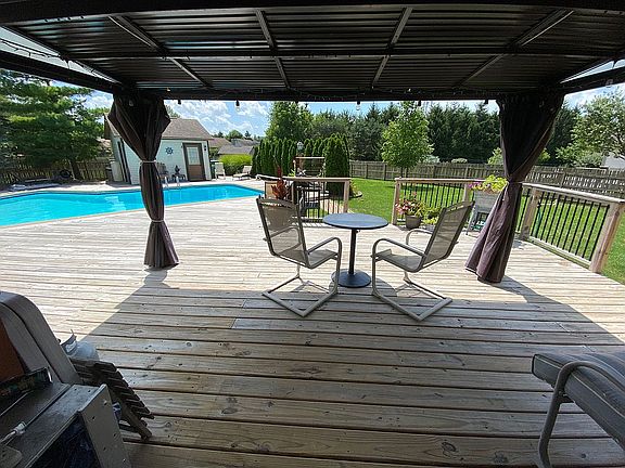 Need a vacation? Vacation at home! Large fenced in back yard features heated in-ground pool with slide, huge deck for entertaining, pool house with half bath and dressing area on one side and pool equipment and storage on the other, additional shed for more storage. Roomy 4 bedroom 2.5 bath home, living room with bay window, dining room, family room with fireplace and bay window, kitchen with new granite counter tops, stainless steel appliances, breakfast bar and eat-in area, 1/2 bath with new vanity, quartz top and bowl sink, mud room off garage, laminate flooring throughout. 4 bedrooms upstairs, master bedroom features vaulted ceiling, ceiling fan, his and her closets (one walk-in, one sliding doors) with new organizers and remodeled (2018) bathroom with large porcelain tile shower, new vanity with quartz top and luxury vinyl plank flooring. The hall bath remodeled in 2018 has a deep soak tub, porcelain tile tub surround, cultured marble vanity top, linen closet and luxury vinyl plank flooring. The hall closet has walk-in access to the attic storage above the garage. The 3/4 basement is carpeted with 2 recreation rooms, projector TV with 120" pull down screen, under stairs storage with the water heater and furnace, large laundry room with water softener, sump pump with 2 pumps and battery backup and lots of storage. The square footage includes the finished portion of the basement. 2 car attached garage with pull down stairs to attic. New roof in 2020, new water heater in 2022, new pool pump in 2021, new pool heater in 2020. HOA is $210 a year. Do you like your neighbors? We LOVE ours!! Wonderful Bridlewood neighborhood, great family home with Carmel address, Westfield schools and the best neighbors in the world! Showings by appointment only. 317-373-1786 Realtors welcome - paying $5,000 buyer's agent commission at closing.