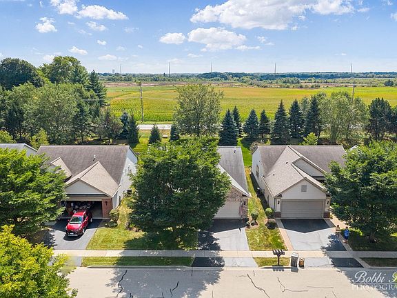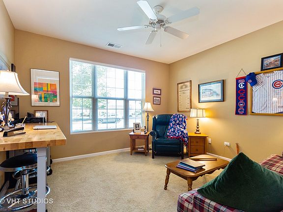 Immaculate Wilmette model with Premium Location against the Berm. Kitchen has 42" maple cabinets, corian counters, hardwood floor, can lights, and stainless steel appliances (Refrigerator and microwave, disposal, washer, dryer, humidifier & HWH have been replaced). Crown molding in Kitchen, Eating Area, LR & DR. DR has chair rail & foyer has wainscoting also. DR fixture replaced.Bay window in Mstr.Bdrm. Water softener and instant hot water also. Garage floor has epoxy. Concrete patio has been extended with paver bricks and partial wall, new landscaping and crab apple tree. Seller leaving patio set and barbecue grill. Some furniture also available for sale (new when he moved in). Edgewater by Del Webb is an over 55+ adult community, one person needs to be 55. Amenities in HOA covers snow removal (2" or more), grass mowing, etc, Creekside Lodge indoor and outdoor pool, fitness center, tennis, bocce, etc, gated community & guard 24/7, seal coating driveway every 2 years) Lodge is starting to open in Phase 4 on limited basis.
