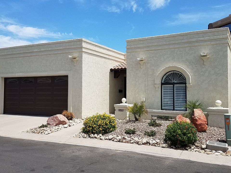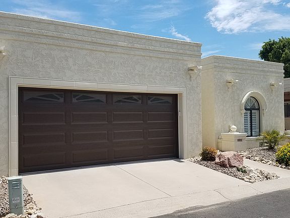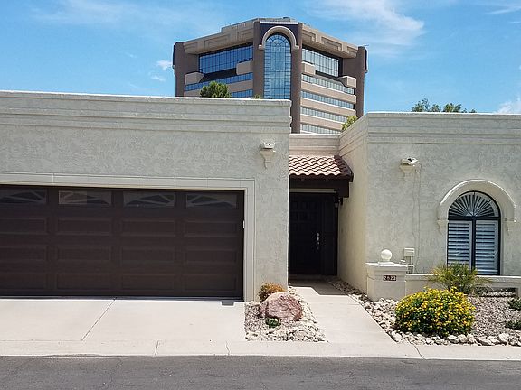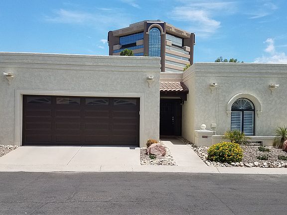Rare opportunity in exclusive Edgemont Estates! This single level 2BR 2BA 1362 sq ft home w/2 car garage & extremely private back yard is tastefully decorated & meticulously cared for! The community has only 17 homes that seldom come for sale! From the moment you walk-in, you will feel at home! Charm & tranquility greet you at the door! The elegant entry flows into the living room w/Venetian plaster walls, clerestory windows, stained concrete, & wood beam 13 ft vaulted ceiling. Corner wood-burning fireplace adds ambiance & timeless charm. Formal dining room is perfect for holiday get-togethers & the eye-catching kitchen features white cabinets w/glass shelves & multicolored LED lighting! A perfect combination for your dinner parties! Then head outside to your covered patio & back yard