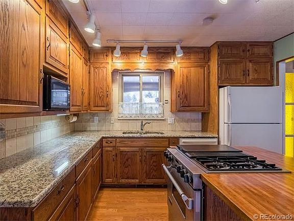 Wonderful, clean 2 story, with a huge yard, with covered and open decks. Nice open kitchen, spacious eating area. Custom cabinets, slab granite, tile backsplash, island with Jen-aire gas stove, wood laminate floors. Step down to the cozy family room with a wood /fireplace stove and bay windows. There is also a large living room. Upstairs is a master that opens to a sunroom and roof top deck, master bath and 2 bedrooms and a full bath. The basement is finished with laundry room, sink and lots of storage .Newer windows, H2O heater, and roof. Check out the tandem garage, owner is a car buff, work bench, skylights, heated, water and a double door out the back plus a storage shed. Walk to Bear Valley Park, easy to 285. Does need some updating.