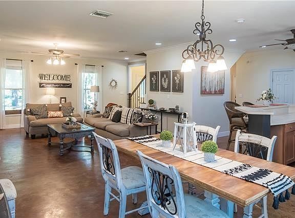 Welcome to 28230 Stanga Lane, a charming brick home nestled in a picturesque tree-lined neighborhood just north of Hwy 22 in the community of Bedico. This stylish residence features a wide-open floor plan that seamlessly combines comfort and functionality. Upon entering, you're greeted by a cozy den with a corner-set brick fireplace, great for gatherings or quiet evenings. The spacious dining room overlooks a lush lawn and a shady grove of trees, providing a serene backdrop for meals. The design flows effortlessly into the gourmet kitchen, complete with a wrap-around high-top breakfast bar, custom maple cabinets, stainless steel appliances, and a side-yard exit for easy outdoor access. The home is designed for low maintenance, showcasing stained-concrete floors that blend durability with modern aesthetics. Inset lighting enhances the living space, while neutral paint colors allow for personal touches. Natural light pours in through numerous windows, creating a warm and inviting atmosphere. The gracious owner's suite serves as a private retreat, offering space for a sitting area or desk and an ensuite bath featuring elegant granite counters and custom tile work. With three additional spacious bedrooms as well as an office space, and a lofted recreation room, there is ample room for family, guests, or even a dedicated hobby space. Outside, the property spans almost 5 acres, featuring a wraparound porch overlooking a pond, a creek with access to Lake Ponchartrain from Bedico Creek, and a large back yard great for enjoying early mornings and late afternoons. Multiple sitting areas and a classic porch swing provide an inviting outdoor escape. The XL double bay two-story barn offers extensive storage for lawn equipment and recreational vehicles, adding practical value. Plus, there is potential for expansion with rooms already studded out for a studio apartment or mother-in-law suite upstairs. This home combines comfort, style, versatility, and so much more.