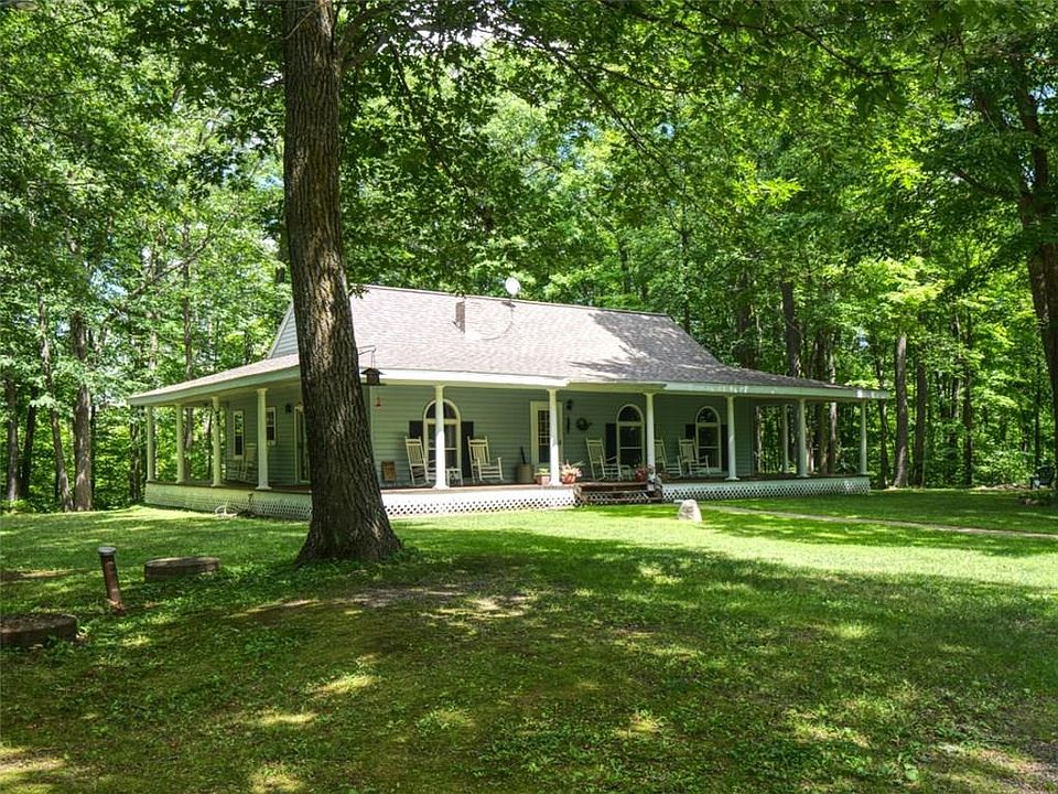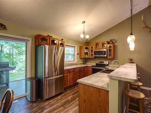 Turn-key & ready for you! Leave your problems behind & enjoy rest & relaxation at this private bungalow tucked in the trees. A short 1.5 hours from the Twin Cities awaits the perfect getaway situated on 5 wooded acres. Take in wild life, listen to the tranquil sound of owls, & lose track of time on the wrap around deck. Warm up next to the wood burning fireplace on cold days or enjoy the outdoor hot tub. This home has it all, for any season with proximity to many lakes, ATV/snowmobile trails, & hunting. Largon Lake boat launch is right down the street. Step into the open floor plan, complemented by vaulted ceilings & an eat-in kitchen. Perfect for entertaining company inside & out. You'll always find your way to the large porch, with access from each master bedroom, kitchen, & front entry. Each master features a private bath. One master boasts a large walk-in closet. Take full advantage of the full lower level waiting for your finishing touches. Peaceful living awaits - make it yours!